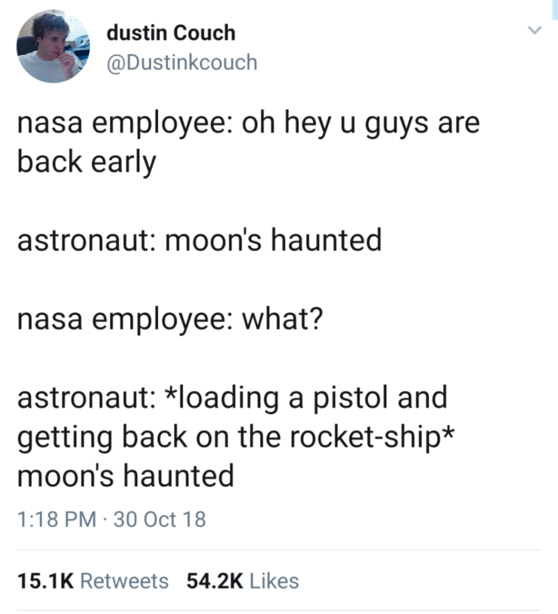 ‘you’re back early’ is the most hilarious phrase to me in this context. like, you’re back early. from the moon. which takes days to get back from, and also definitely the assistance of this nasa employee. but somehow we managed it and just decided to drop by nasa for you to make this casual remark. yep. a logical setup to any joke.