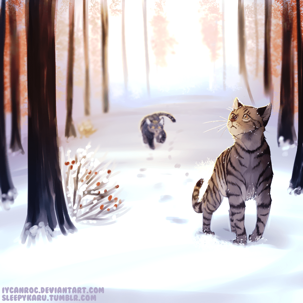 It finally snowed here! To celebrate, my longtime friend and a co-author of Warriors Rewritten has become obsessed with Longtail recently, so here’s Longpaw’s first winter with a grumpy, cold Darkstripe trudging behind.