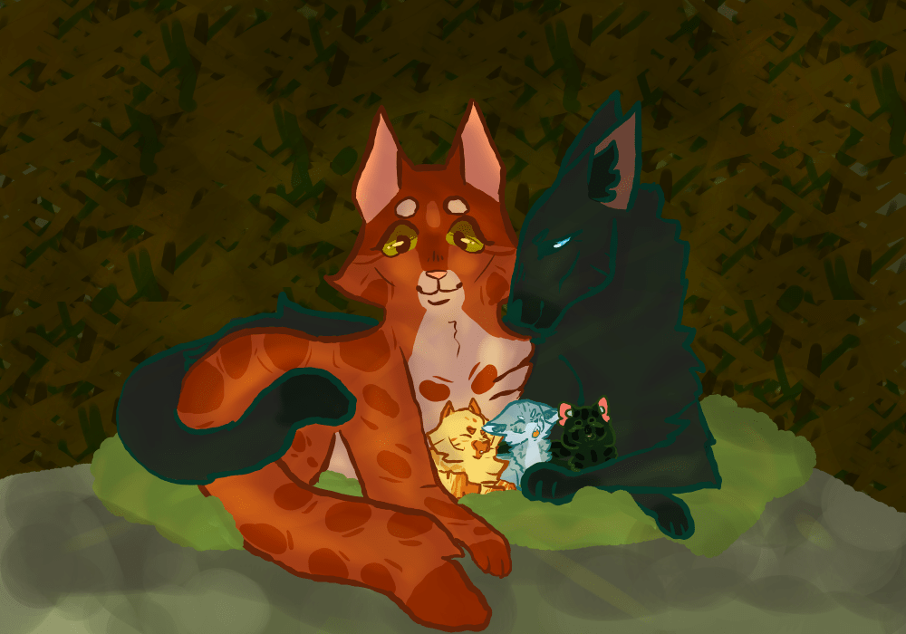 The three are born and Leafpool takes a quick break with Brightheart and other cats helping out. Crowfeather is thrilled and as they grow older take turns with Squirrelflight and Brambleclaw in taking care of them. Brambleclaw and Squirrelflight are proud Aunt and Uncle and since they haven’t been able to have their own kits love to help out.