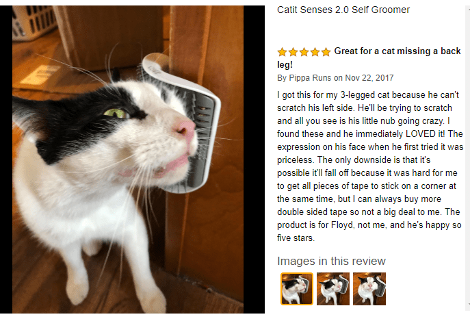 I’m not over this review of a self groomer for a three legged cat. Look at him. He hasn’t been able scratch his left side by himself since he lost his leg but now he can and he is living life the fullest. That is the face of a cat who has finally scratched an itch.